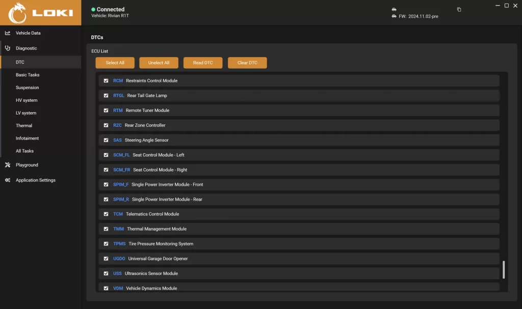 LOKI PRO 可与所有 Rivian 控制单元通信,并允许您读取、解码和清除诊断故障代码 (DTC),包括来自以下方面的代码: